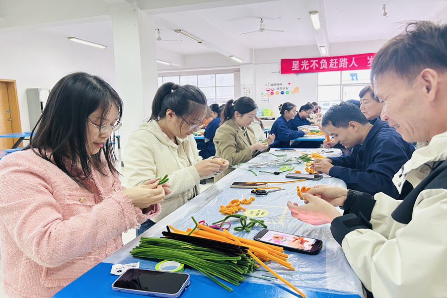 活动现场,指导老师侯梦喆细致讲解向日葵制作步骤,从材料裁剪到组装成型,耐心示范每一个细节。员工们紧随指导,一步一骤地投入创作,原本零散的材料,在大家的巧手中逐渐变成一朵朵饱满鲜活的向日葵,也将团队的凝聚力与归属感,悄然缝进了手工里。