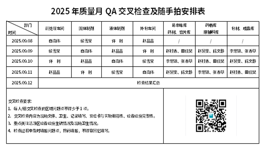 从 “他人监督” 到 “自我审视”,是质量管控升级的关键一步。为强化全员质量责任,落实GMP实际应用,9月15日-9月20日由质量管理负责人张立红亲自带队,严格依据《2025年9月自检方案》推进自检工作。